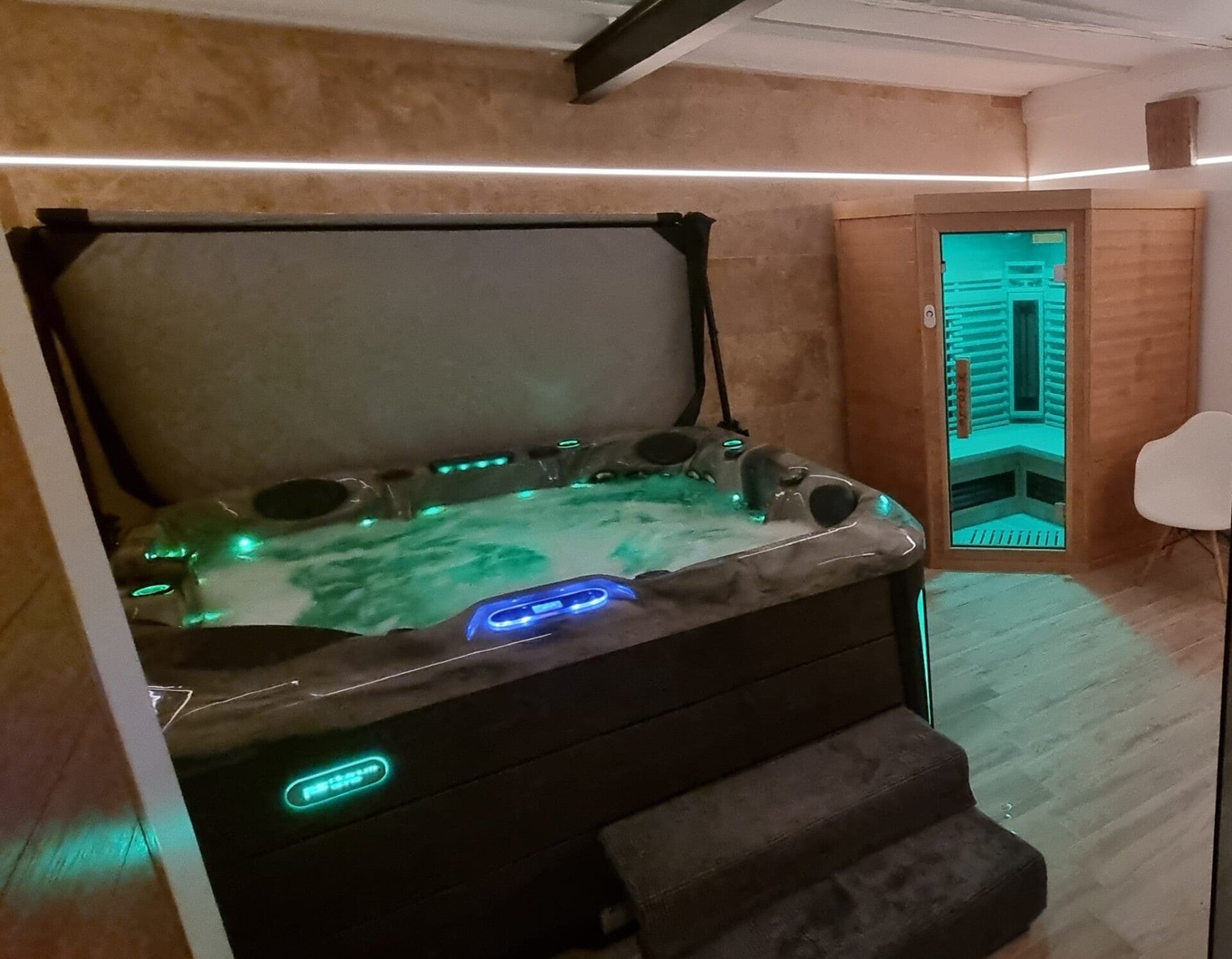 Evadez vous dans votre cocon privatif. Entre les bulles d'un grand spa 5 places, la chaleur d'un sauna infra rouge et la douceur des peignoirs et serviettes fournis, tout est prêt pour vous accueillir.